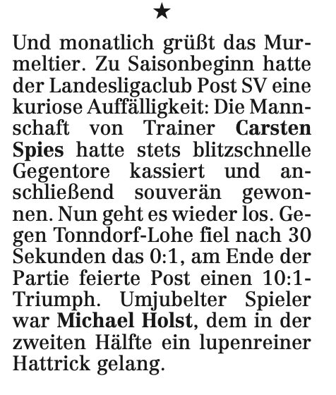 Während Maik Hochheuser also unter falschem Vornamen traf, fehlte ein anderer zunächst komplett: Michael Holst, der Toptorjäger der Vorsaison (26 Treffer). Sobald er wieder auf dem Platz stand, wurde der Post-Angriff endgültig zur Maschine. Gegen Tonndorf-Lohe erzielte er in der zweiten Hälfte einen lupenreinen Hattrick, der ihn zum „umjubelten Spieler“ des Tages machte. Und insgesamt passte das alles perfekt zum Stil dieser Saison: Musste der Post SV ein frühes Gegentor schlucken, antwortete die Mannschaft mit purem Offensivdruck.